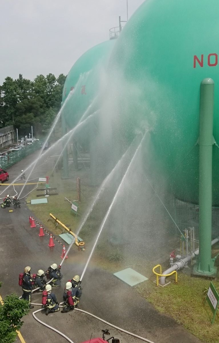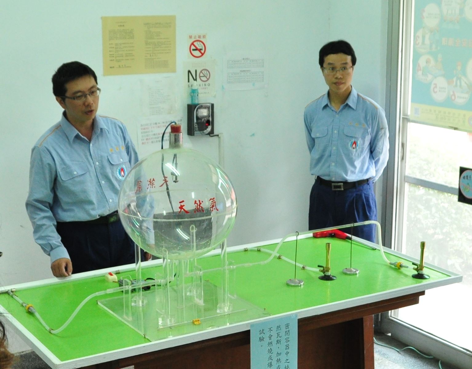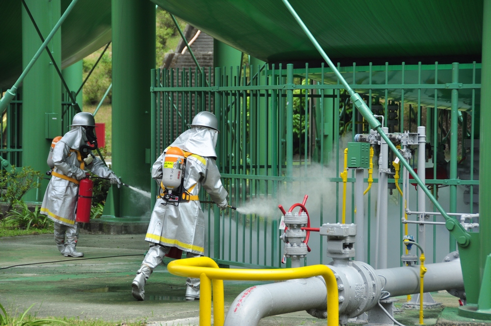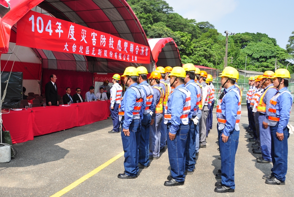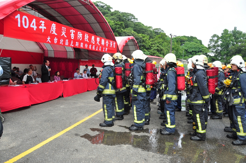 狀況五、由大台北瓦斯公司摸擬演練儲氣槽遭飛機恐怖攻擊致槽區管線漏氣著火搶修及傷患救護,並緊急啟動槽區消防自動遙擺噴塔及消防幫浦射水降低儲氣槽週邊温度外,另由內湖消防隊支援消防車實作聯合灑水演練。當日的演習迅速確實獲得主管單位台北市政府長官的讚許,大台北瓦斯並當場以瓦斯槽模型內連續點火,槽內之瓦斯不會燃燒也不會爆炸,證明瓦斯槽安全無虞,且向在場官員及來賓說明,自有文獻以來天然氣瓦斯槽從未發生爆炸,二次大戰日本廣島原彈爆炸,廣島夷為平地,惟瓦斯槽屹立不搖,就是最好的明證。官員及來賓也一致認為這些模型示範可以廣為宣導,可讓民眾更正確了解瓦斯槽的安全性。 對於台北市民天然瓦斯用氣安全的用心,四家瓦斯公司在這一次的演習再一次做了一個最好的見證。