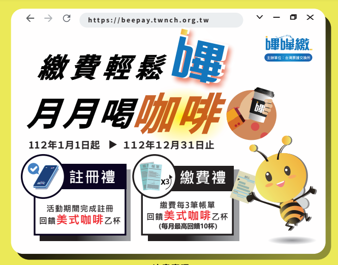 1.即日起至112年12月31日經由電子支付嗶嗶繳繳納帳單,可獲得繳費獎勵回饋。