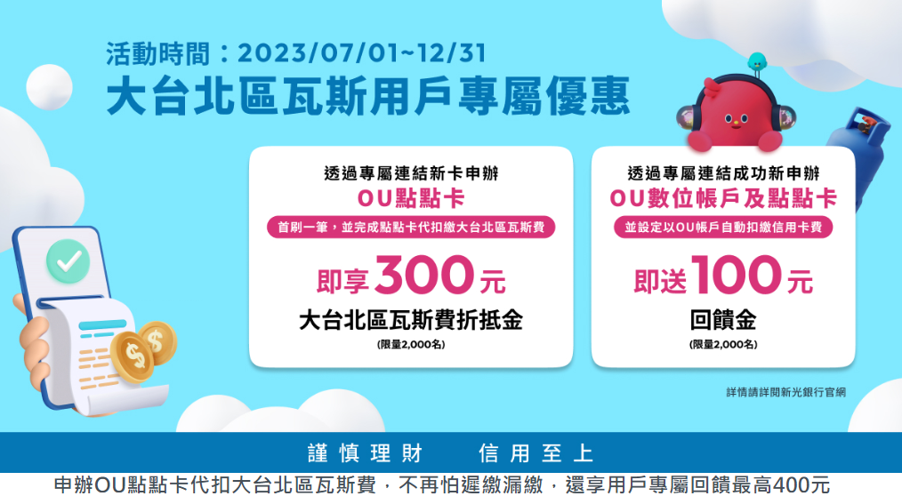 新辦新光OU數位帳戶及點點卡扣繳瓦斯費,最高獨享400元回饋!