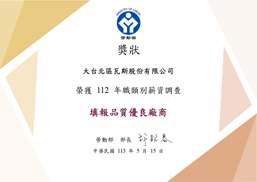 勞動部每年辦理之「職類別薪資調查」為政府制定勞動政策,及勞資雙方掌握勞動市場各職類薪資水準之重要參據。為感謝長期支持與配合調查之受查廠商,勞動部特辦理「112年職類別薪資調查填報品質優良廠商」遴選活動,經洽請各協辦機關推薦遴選,「大台北區瓦斯股份有限公司」為獲選廠商之一。