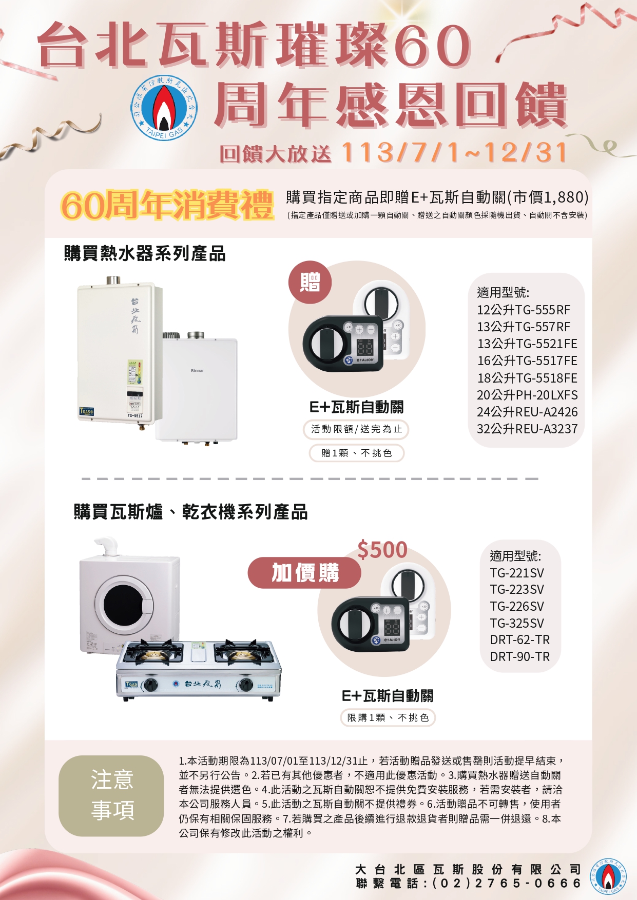 即日起至113年12月31止,凡購買本公司熱水器即贈E+瓦斯自動關, 購買瓦斯爐、乾衣機則可享E+自動關優惠加價購。詳情如下相關文宣所示,若有相關問題請洽(02)2765-0666。